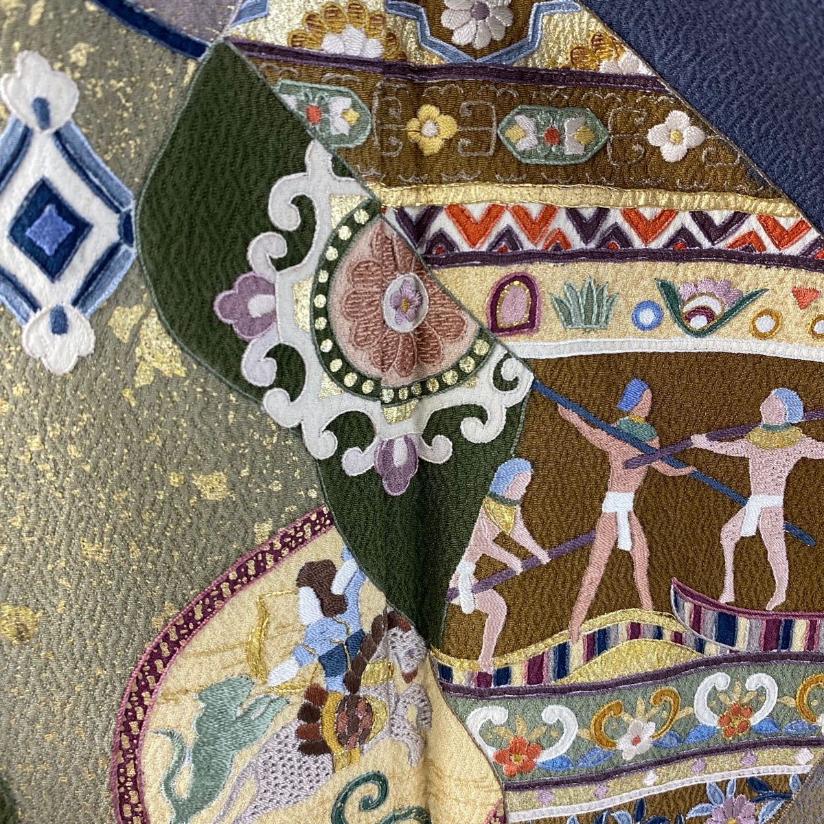訪問着 身丈161 cm 裄丈66.5 M 袷 蒋雪英 落款 コプト柄 蘇州刺繍 金糸 灰色 正絹