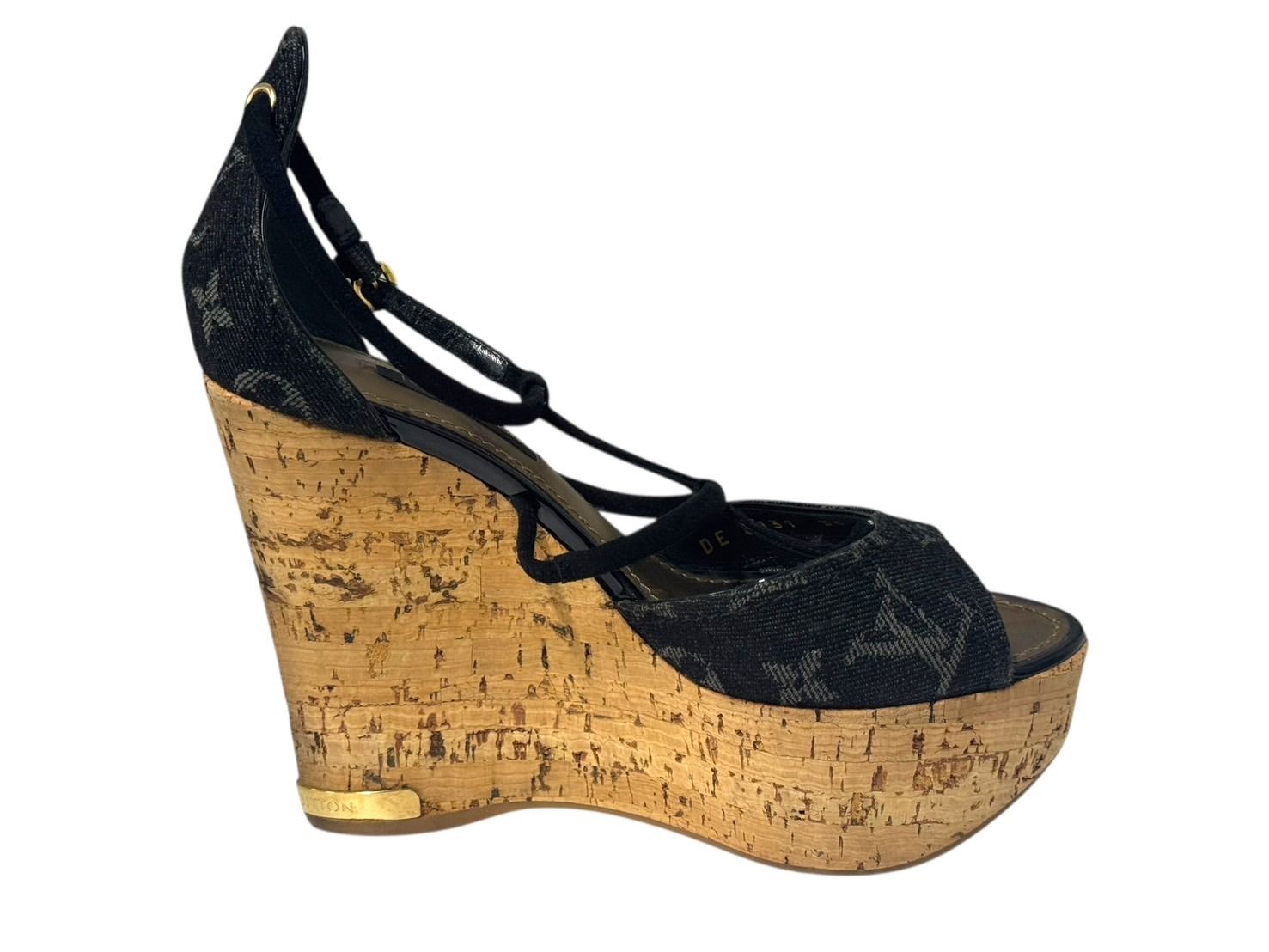 LOUIS VUITTON モノグラムデニム サンダル ウェッジソール DE 0131 ブラック ゴールド サイズ35 4 b 006410