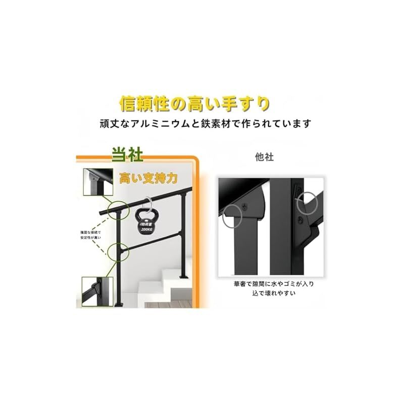 【高品質の手すり】エレガントで高品質の手すり、高炭素鋼素材を使用し、非常に高い耐久性と安定性をする。表面は二重塗装処理されており、優れた防錆・防食性能を持ち、清掃やメンテナンスも容易だ。