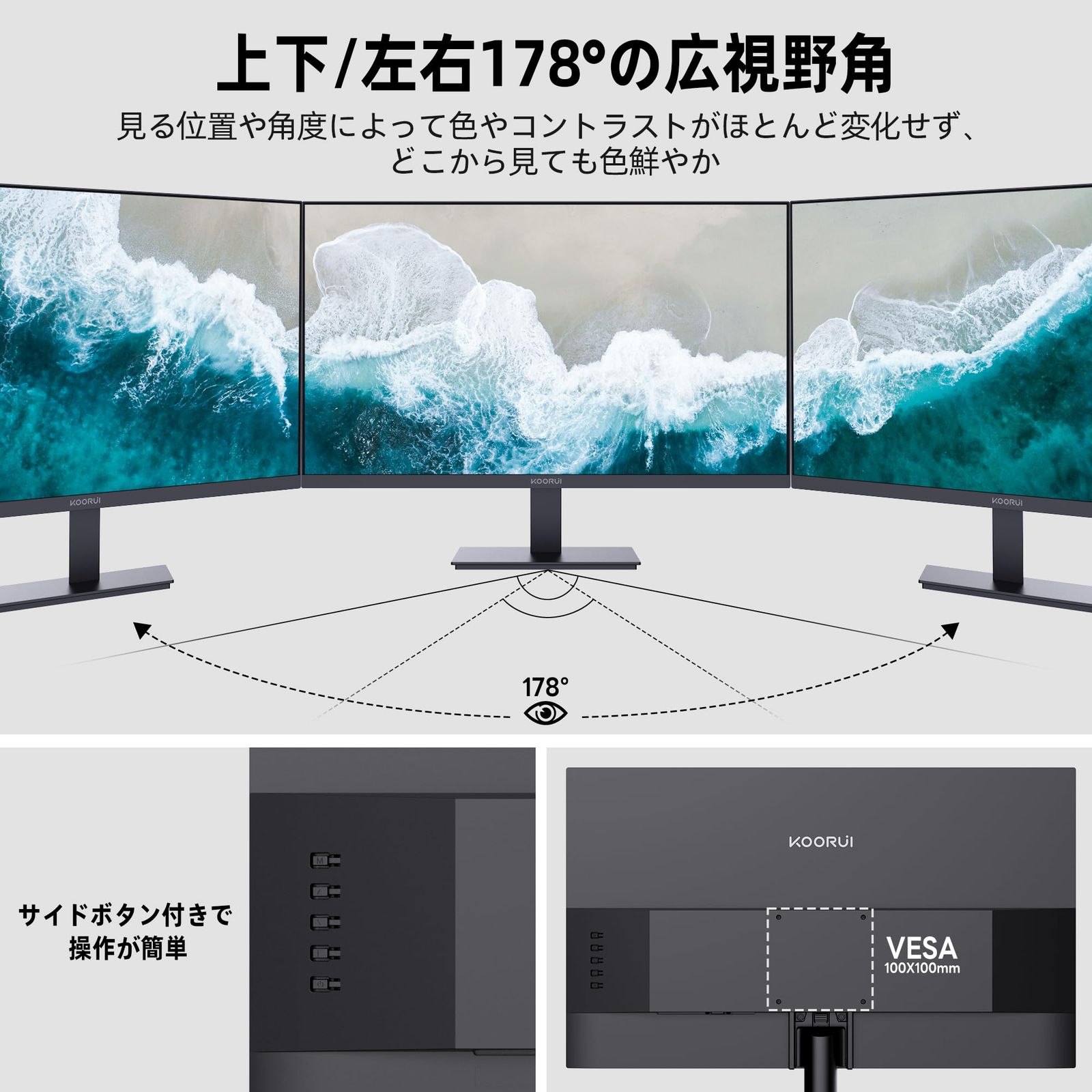 [178°の広い視野角]上下、左右178°の広い範囲で自然な色合いを表示でき、どの角度から見ても鮮やかな映像を見ることができます。