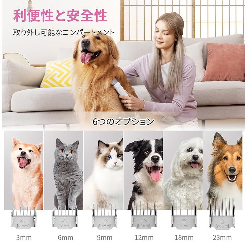 ??【6つの取り外し可能なトリマーアタッチメント】本製品には、ペットの毛をトリミングするための6つの異なるサイズのアタッチメント(3mm、6mm、9mm、12mm、18mm、23mm)が付属しています。髪の長さはご希望に合わせて調整可能です。多段階の長さ調整機能を備えた強力で静かな電動ハサミを使用して、さまざまな長さの毛を簡単にトリミングでき、正確なトリミングと快適な体験をします。