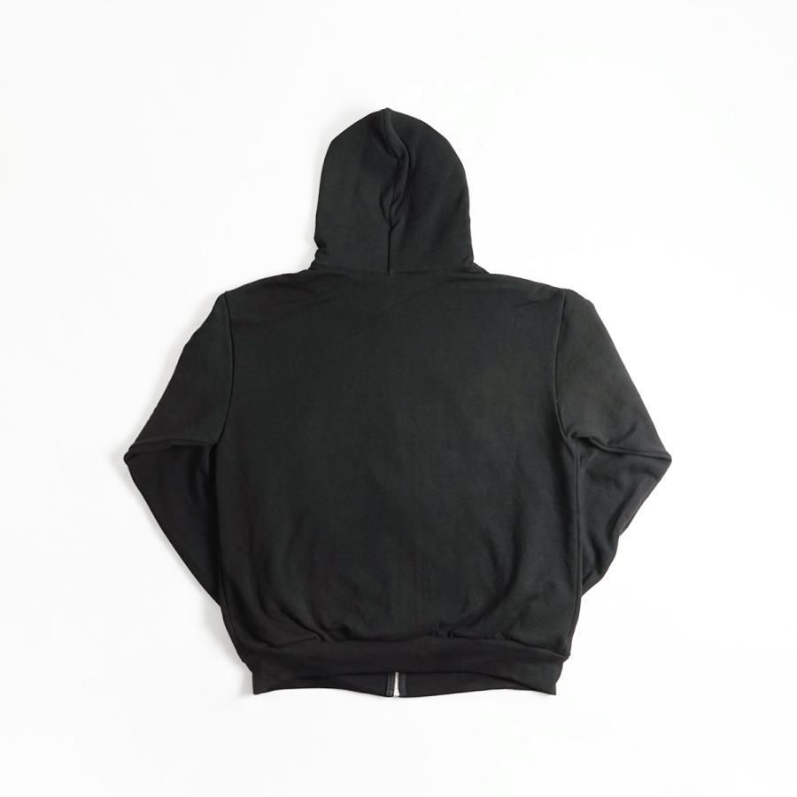 フロントはメタルジップの合わせにカンガルーポケット。フードは存在感のある2重仕立てで、ドローコードのないプレーンなデザインがモダンです。形は旬なボックスシルエット。アームも適度なゆとりがあり着心地抜群。もちろん生産はロサンゼルスで行われています。
