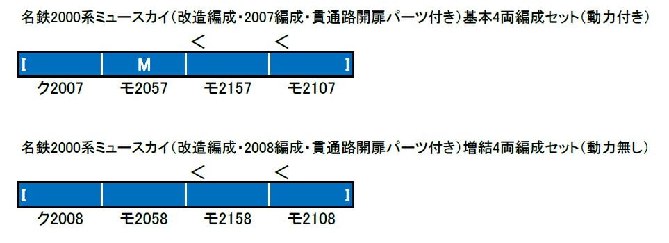 名鉄2000系は、2005年に開港した中部国際空港へのアクセス特急「ミュースカイ」用の車両で、複雑な3次曲面を持った前面や青と白の斬新なカラーデザインとともに名鉄電車の従来のイメージを一新するスタイルが特徴です。登場時は3両編成で運用されていましたが、利用者急増による混雑緩和のため、2006年に全編成の4両編成化のための中間車と、3次車となる4両編成2本の増備が行なわれました。3次車では新たに荷物置き場が設置されその部分の窓配置が従来車と異なります。後に従来車も荷物置き場が設置され、その部分の窓はカーテンが常時下ろされた状態になっています。