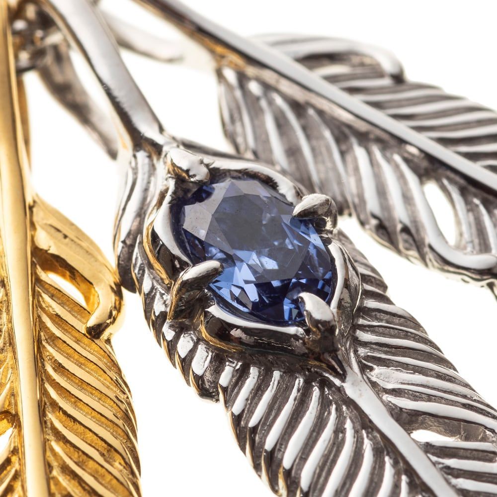 A three-layer feather pendant that balances stage presence with everyday elegance. Each feather is finely engraved from quill to edge, creating dimensional shadows that move with you. A tanzanite-color cubic zirconia glows at center, adding a cool blue accent at the chest. The feathers are finished in a balanced mix of rhodium and 18K yellow-gold plating for refined contrast. Wear all three together for impact, or separate them for a subtler look—easy to style from casual to mode, and designed to be unisex. A versatile piece that pairs beautifully, gifts well, and stands up to repeat wear.