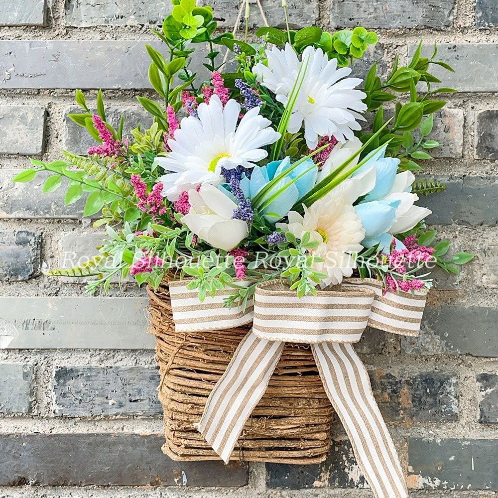 ロイヤルシルエットがお届けするフラワーバスケットは、華やかさとナチュラルな温もりを兼ね備えたインテリアアイテムです。ボリュームたっぷりの花々がバスケットにぎゅっと詰まったデザインは、玄関やリビングを一気に華やかにしてくれます。置いて飾るのはもちろん、吊るして使うこともできるので、壁やドアなど様々な場所で楽しめます。