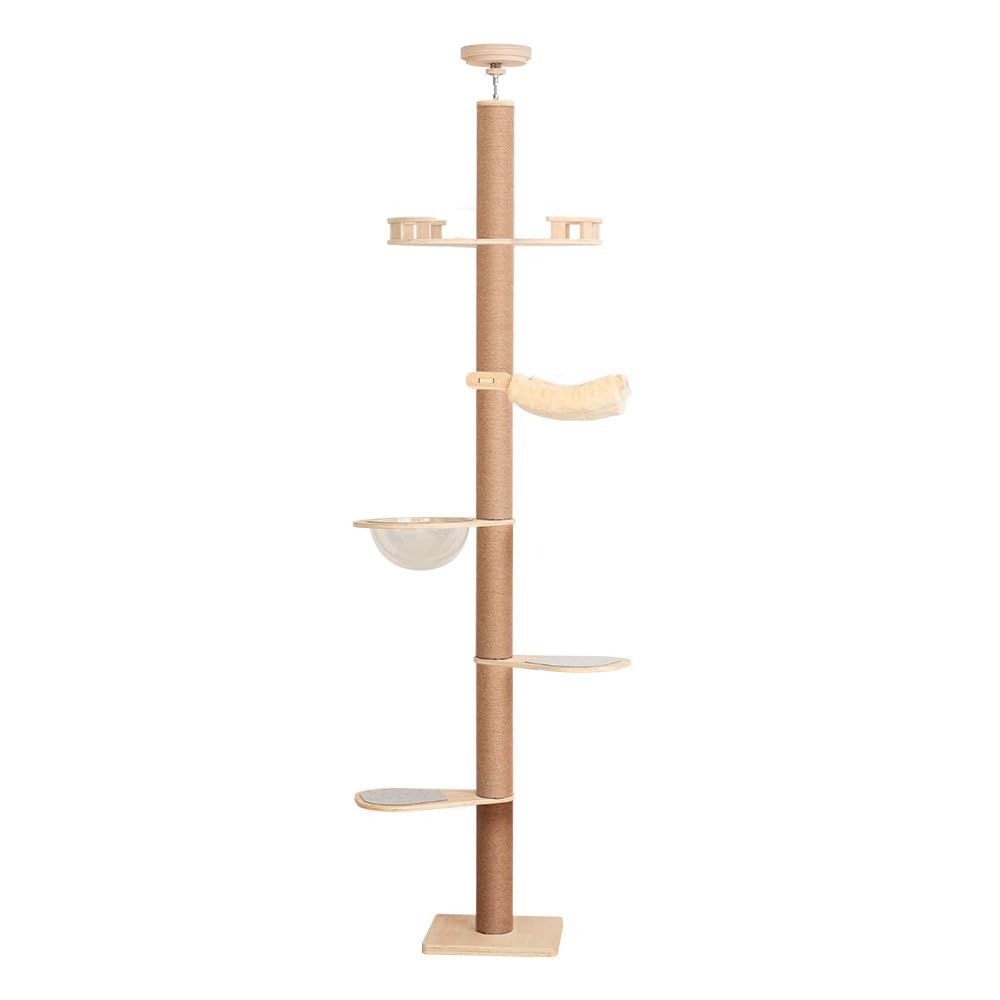 なになにLIFE 6段 キャットタワー 突っ張り スリム 木製 極太支柱12cm シニア猫 【超厚い特注合板厚さ15mm】 宇宙船 シンプル キャットツリー 猫タワー 大きいステップ 太い支柱 大型猫 成猫 子猫 上下しやすい導線 中型 おしゃれ 省スベース 宇宙船ボウル 隠れ家 爪とぎ 滑り止めマット付き 多頭飼い インテリア性 安定 195~267cm ハンモック 天然麻 コットン紐 展望台