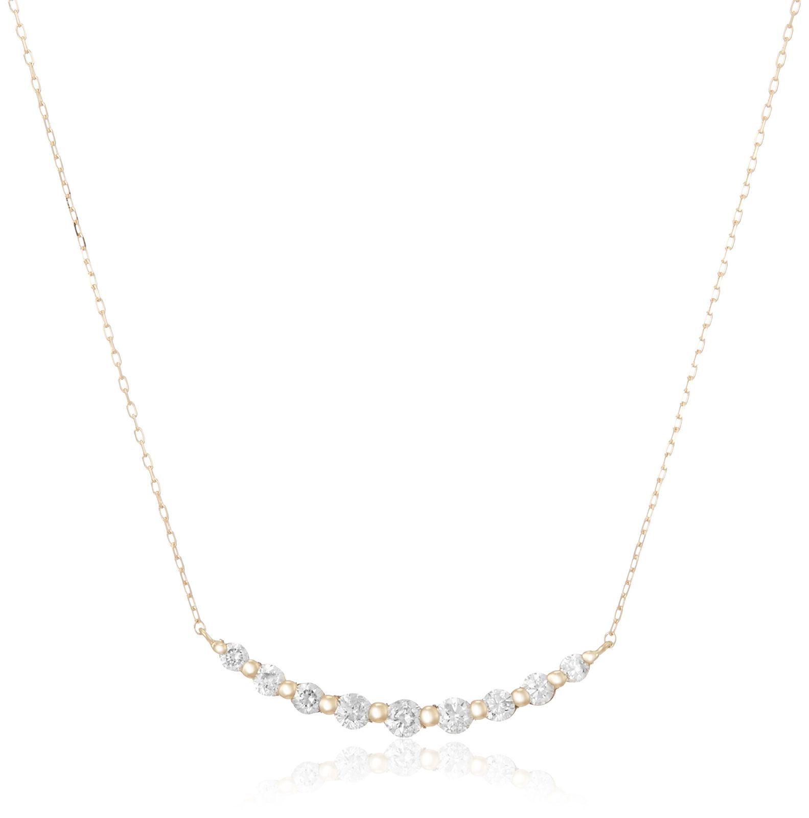 ダイヤモンドを横並びにセットしたラインネックレス。緩やかなカーブをつけたUラインのダイヤモンドは、シンプルで魅力的かつ上品な胸元を演出します。ダイヤモンドの煌めきが胸元を華やかに飾り、カジュアルにもラグジュアリーなシーンにも活躍してくれます。
