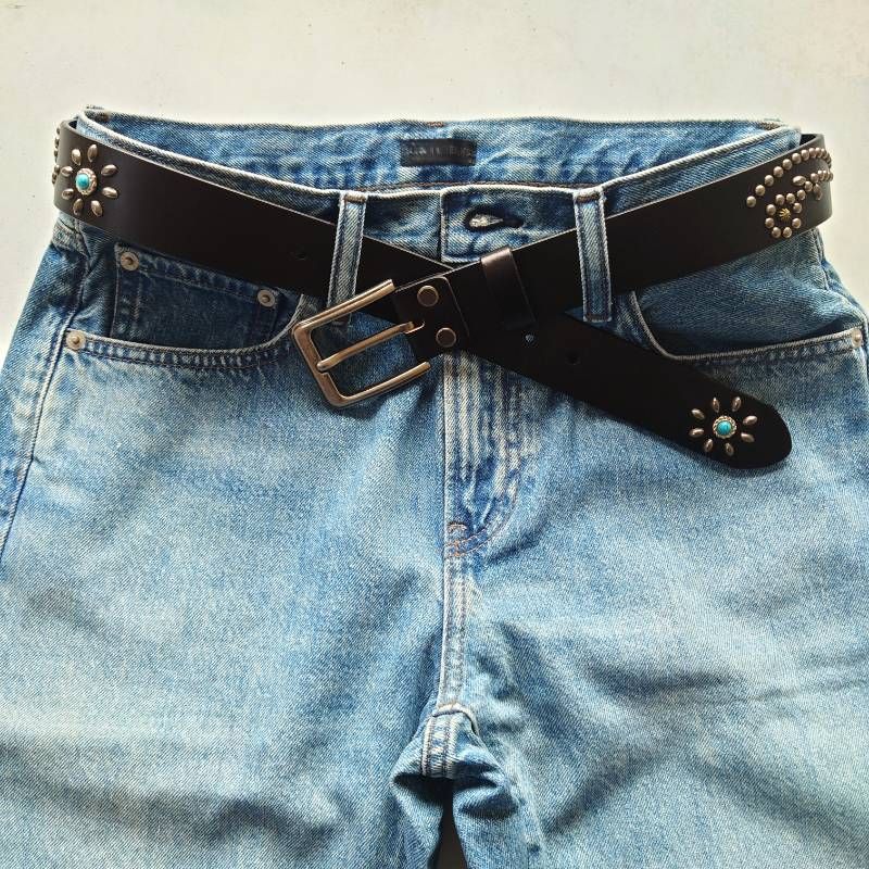 スタッズベルト オリジナル 牛革 フラワー ターコイズ レザー ベルト アメカジ ウエスタン ナロー ブラック COW LEATHER Flower Studs belt Original TRQ BLK
