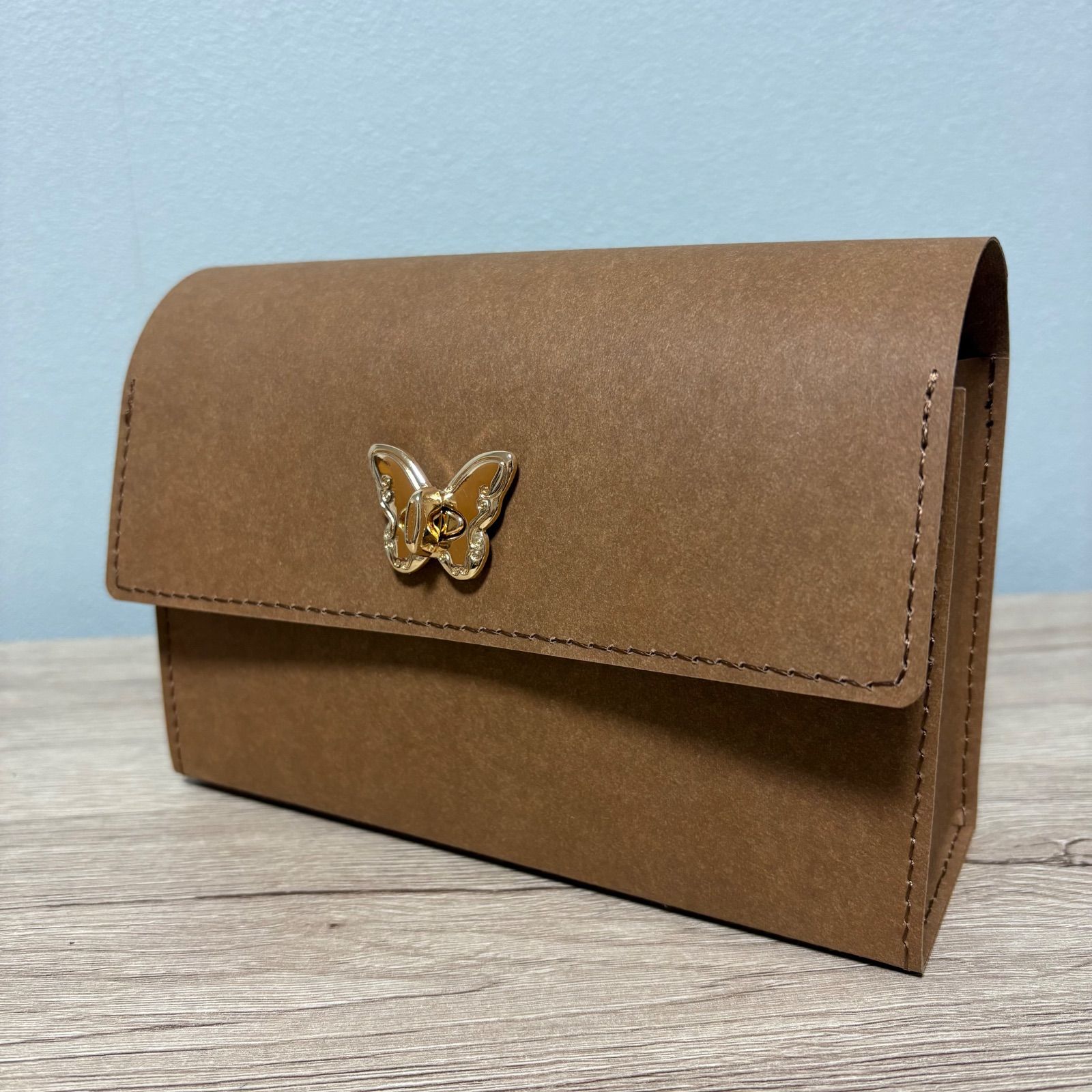 見た目や手触りは紙に似ていますが、特殊な加工が施され水にぬれても破れたりふやけたりしない布のような性質も持っています。ジーンズのブランドラベルにも使用される素材です。使い込んでいくうちに手になじみ、シワや折れ目がつくこともあります。そういった経年変化を楽しむこともできます。