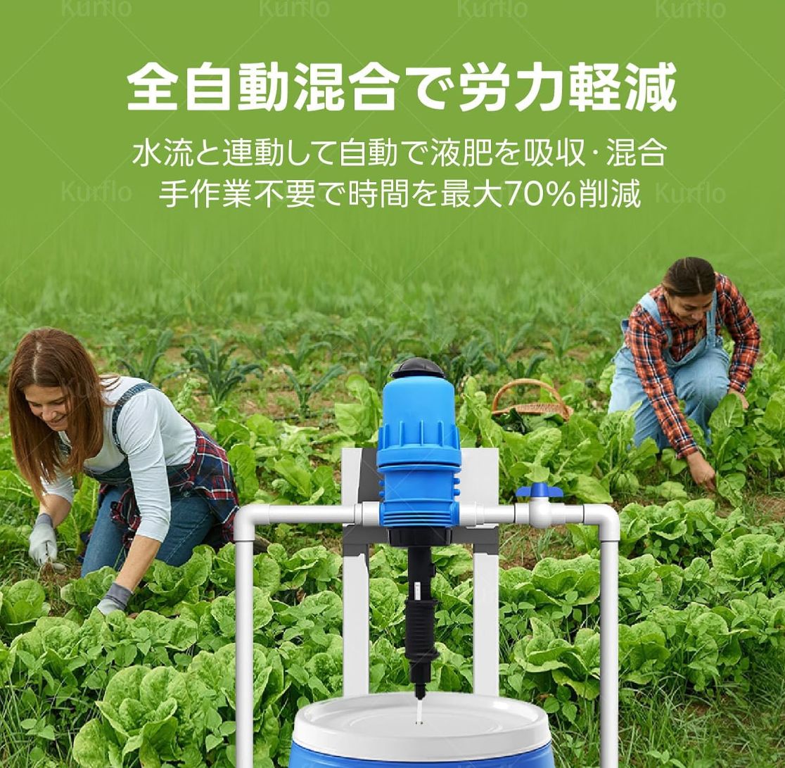 全自動混合で労力軽減:比例式液肥混入器が水流と連動して自動で液肥を吸収・混合。手作業での攪拌が不要だから、水栓を開くだけで施肥作業が完了。液肥混入器の自動化で時間を最大70%削減可能。