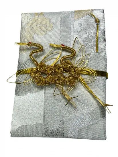 着物/帯から作られたご祝儀袋です水引もイメージに合わせて仕上げました