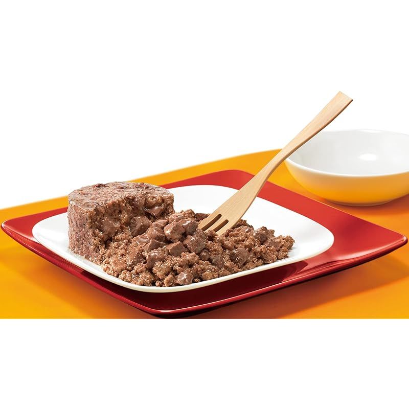 原材料:肉類(チキン、ビーフ等)、植物性タンパク、食物繊維、ビタミン類(B12、D3、E、コリン、パントテン酸、葉酸)、ミネラル類(Ca、Cl、Fe、I、K、Mg、Mn、P、S、Se、Zn)、アミノ酸(グリシン)、増粘多糖類、pH調整剤、着色料(酸化鉄、二酸化チタン)、EDTA-Ca・Na、発色剤(亜硝酸Na)