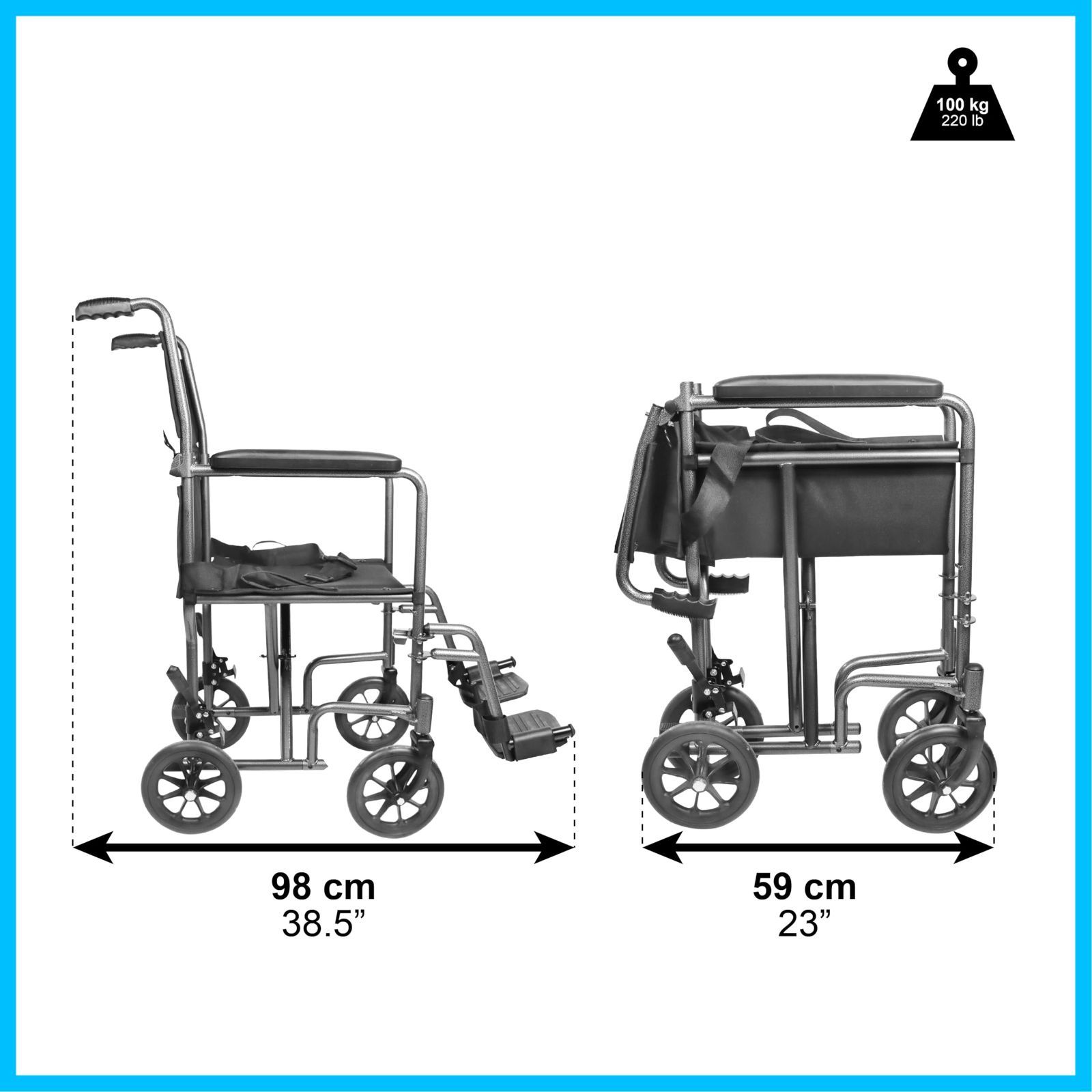 折りたたみ可能:使用者の移乗を容易にする折りたたみ式アームレストに加えて、取り外し可能で高さ調整可能なフットレストと折りたたみシステムが付いています。折りたためれた際の寸法が小さい(29 x 74 x 59 cm)になるため、保管が簡単です。