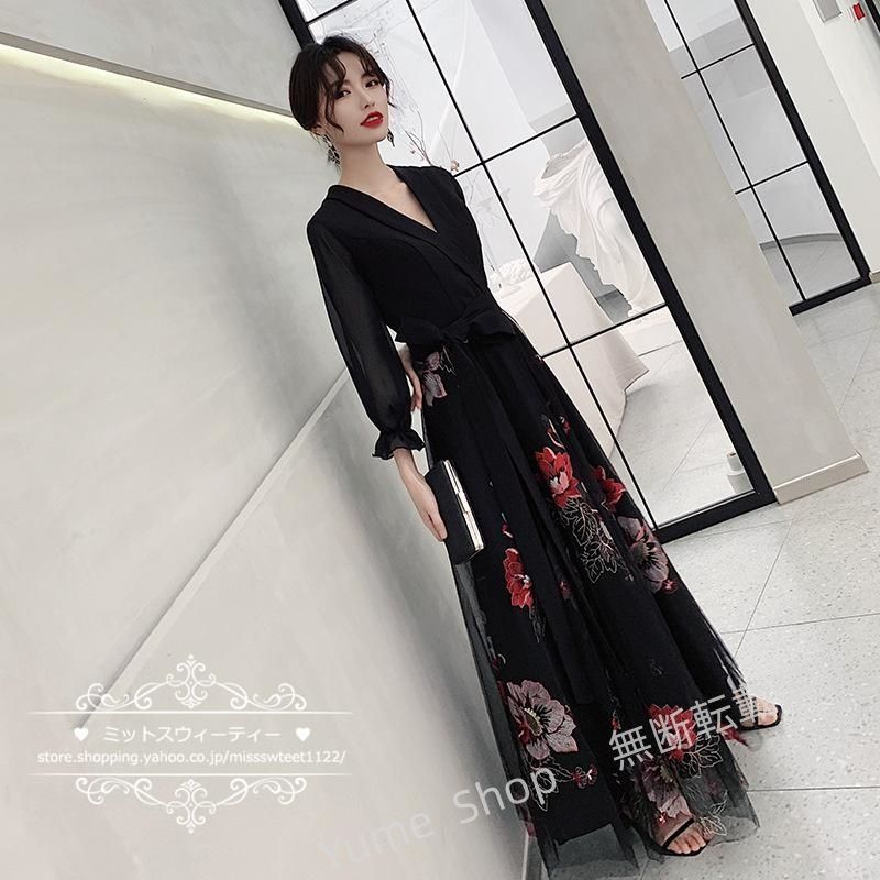 ♥ カラードレス パーティードレス イブニングドレス Aラインドレス 黒 花柄 長袖 Vネック フォーマルドレス カクテルドレス 発表会 演奏会 ブラック ゲストドレス nhdw 154