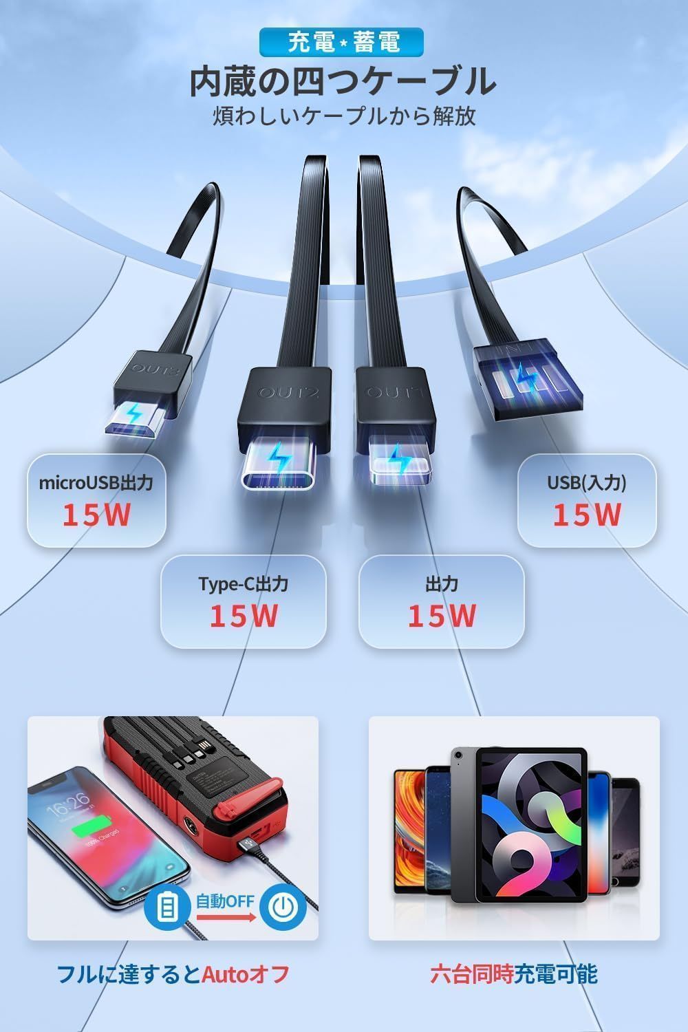 【ケーブル内蔵 6台同時充電可能】Type-C/microUSB/アイフォン用の3規格出力ケーブル内蔵、最大15W(5V3A)の出力に対応し、ケーブルを持ち運ぶ必要がなく、接続したデバイスに応じた最適な電流で充電できます。さらに、2個USB出力ポート、及びType-C入出力ポートに加え、最大6台同時充電が可能なモバイルバッテリーです。スマホをモバイルバッテリーに接続し、電源ボタンを押すと充電開始、旅行、出張時に複数のスマホやデバイスの充電が必要な時でもこの一台で同時にまかなえて、停電、台風、地震など非常時の電源確保にもぴったりなUSB充電器です。