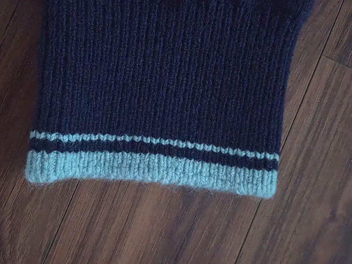 ダークネイビーのカラーと襟はブラックよりも高級感があります。袖口にスカイブルーのアクセントが入っていると、より高級感が増すと思います