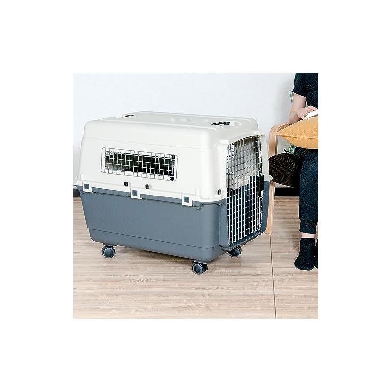 IATA基準をクリア商品です、キャスター(4個)付きで、大型ペットの移動も楽々♪、内2個のキャスターはロック可能なものです。また、そのキャスターは簡単に外せます。上部と下部が分解でき、収入しやすくなる 片手でドアを開けられるペットハウスにもなりますし、ペットの移動には最適です。