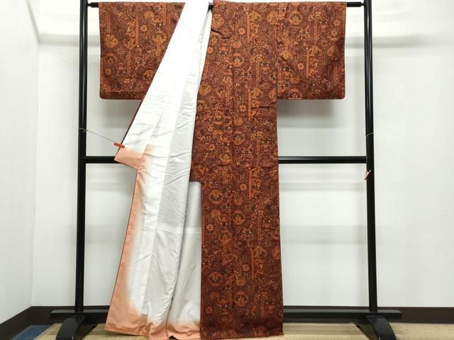 平和屋着物●上質な小紋 紬地 動物更紗花唐草文 正絹 vf