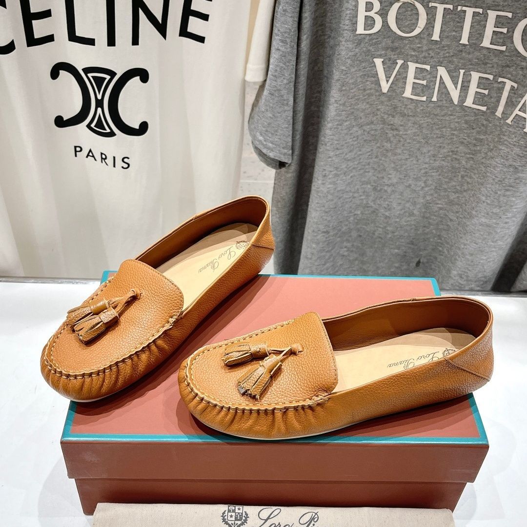 ブラウン23.0 24.5 cm ロロピアーナレディースサマーウォーク モカシン タン カーフレザー タッセル付き ペブルグレイン レザー