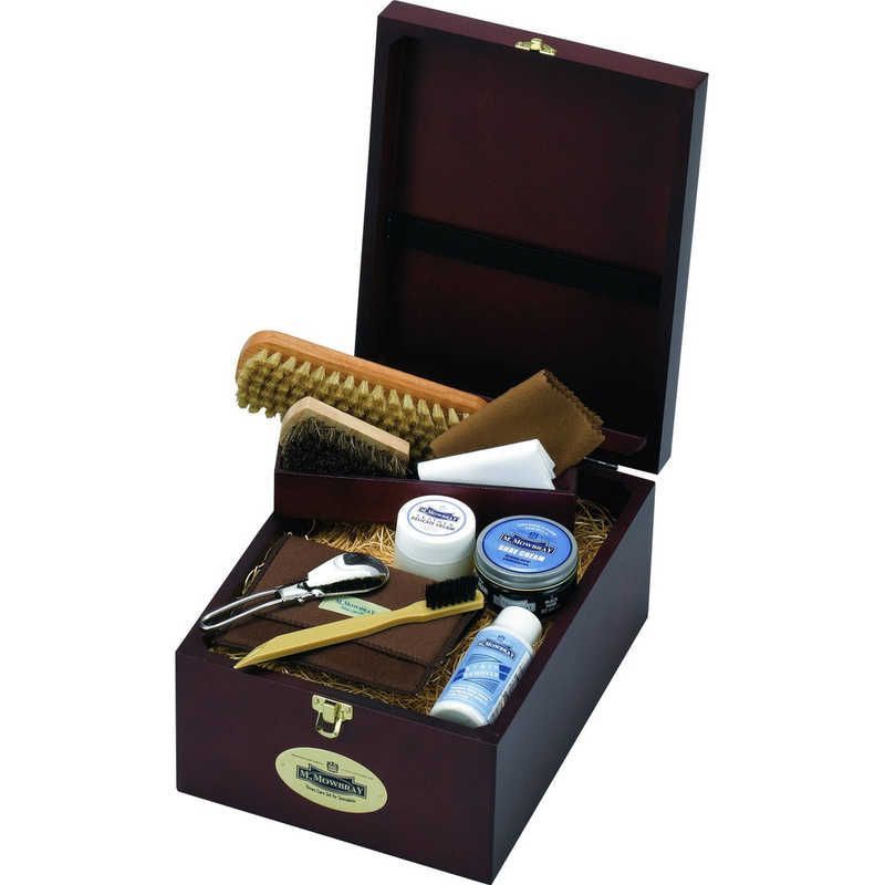 ギフトはもちろんご自身でのご使用にも適しています。バーガンディ色の木箱は日本の職人により丁寧に手作りされ、重厚感のある仕上りです。取り外し可能なブラシやクロスが入る小箱が特長です。