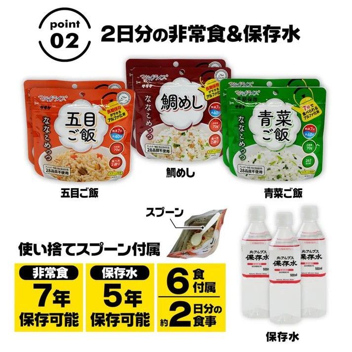 ・非常食/保存水:長期保存可能な保存水3本とアルファ米食品で災害時の食料不足にも対応。
