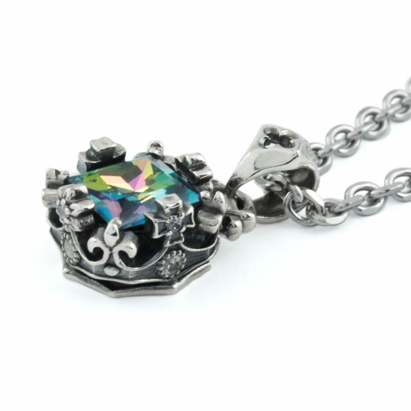 Bring a prism of color to the neckline. This petite pendant centers a square-cut Mystic Topaz whose greens, blues, yellows, and reds shift with every movement, casting a luminous depth across the chest. The stone sits in a crown-inspired square bezel, its prongs and borders finely carved with cross and fleur-de-lis motifs. Polished silver and oxidized shadows play in harmony, giving the piece a refined rhythm and quiet drama.