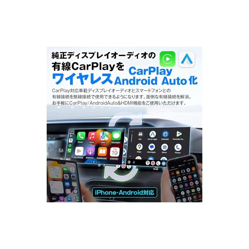 【純正ディスプレイオーディオの有線Apple CarPlayをワイヤレスCarPlay/AndroidAuto化】 Apple CarPlay対応車載ディスプレイオーディオとスマートフォンとの有線接続を無線接続で使用できるようになります。 面倒な有線接続を解消。お手軽にCarPlay/AndroidAuto&HDMI機能をご使用いただけます。