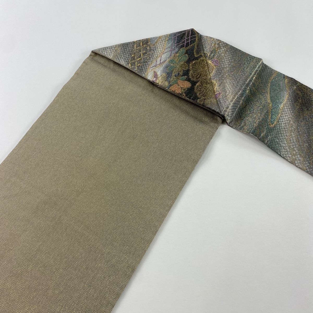 名古屋帯 秀品 草花 霞 金糸 箔 灰緑 正絹