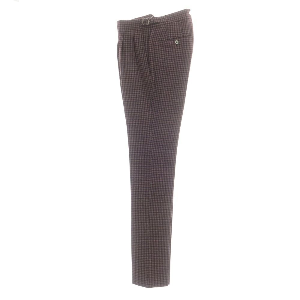 起毛感のある秋冬向きウールポリエステルを用いたスラックスパンツ。メランジ感のあるパープルにブラック系のシンプルなチェックを配した一本。