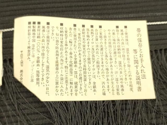 平和屋着物 夏物 西陣 都織物謹製 絽綴れ 八寸名古屋帯 手おり櫛織 流水草花文 黒地 金銀糸 証紙付き 正絹 cm