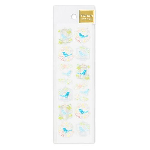 透明感のあるクリア盛りにラメが上品に輝くデザインです。青い鳥と鳥かごを小花で彩りました。淡い色合いで描かれた優しげな印象のシールは大人の方にもお使いいただけます。【検索ハッシュタグ】#シール#ステッカー#とり#トリ#鳥#アニマル#動物#エヌビー#NB#bird#バード#トリ