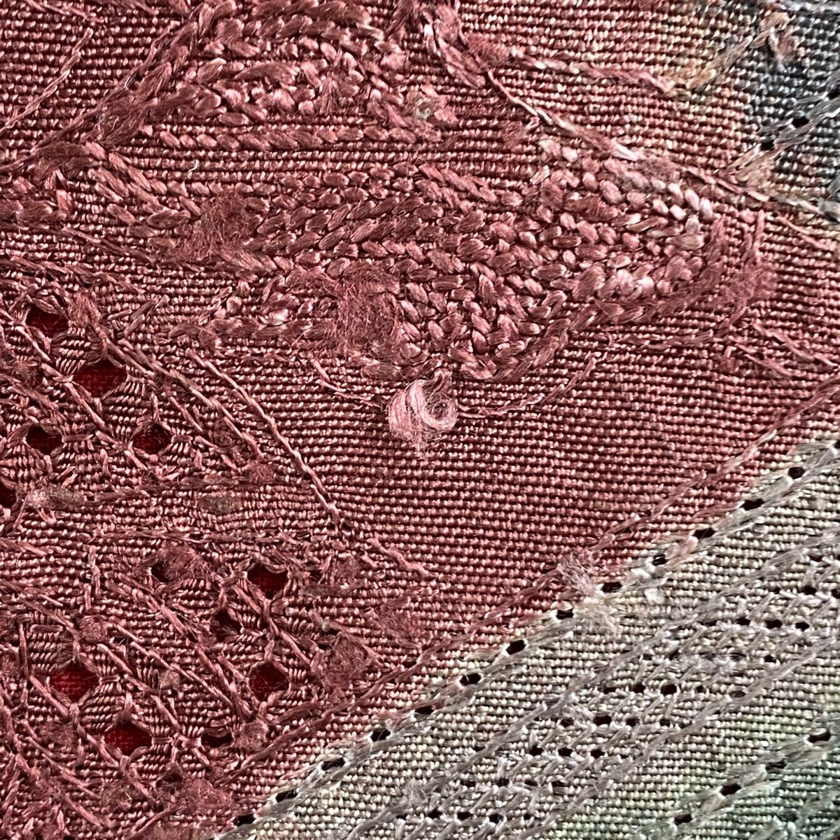 名古屋帯 秀品 紬地 草花 幾何学模様 刺繍 絞り 灰紫 正絹