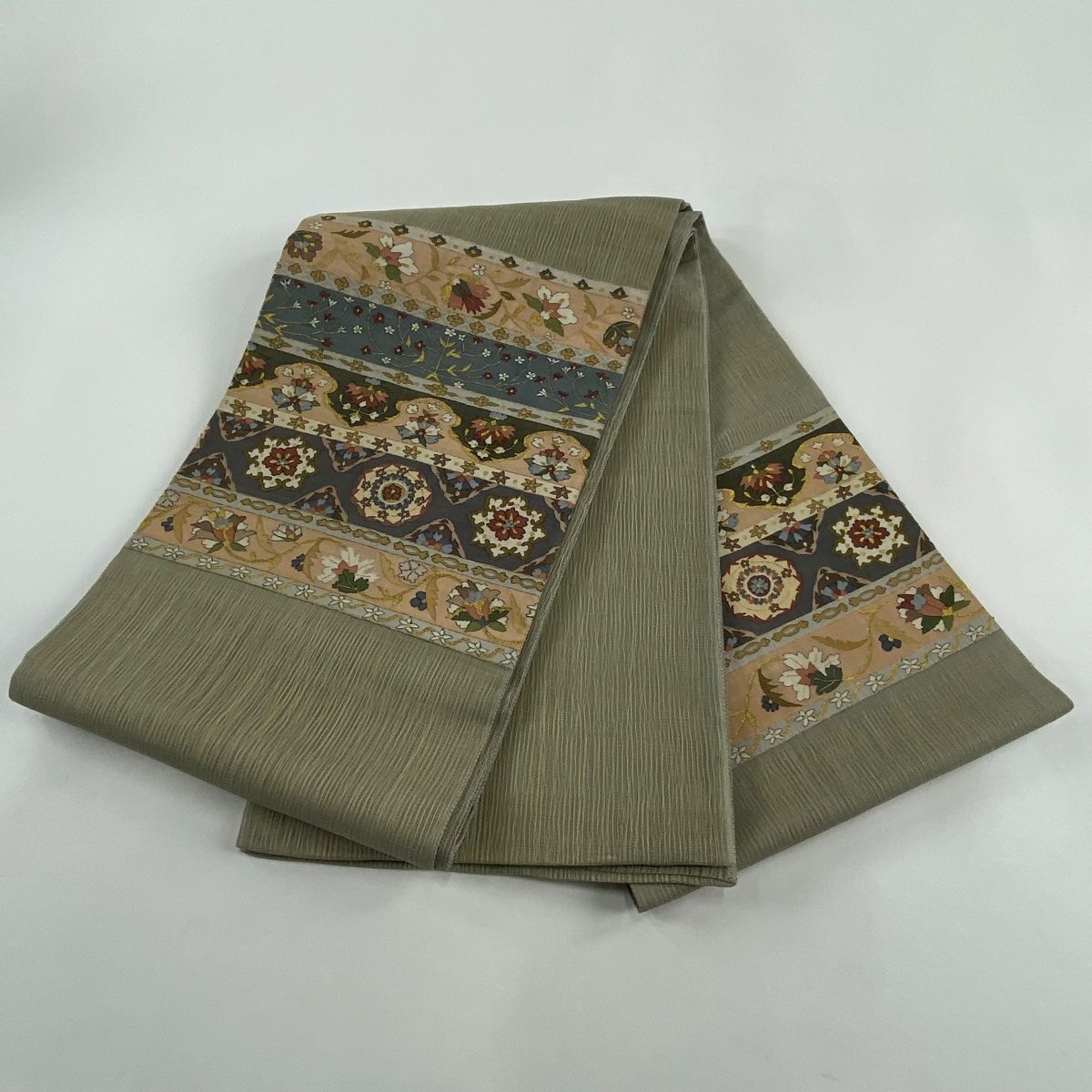 袋帯 華文 草花 金糸 灰緑 お太鼓柄 正絹