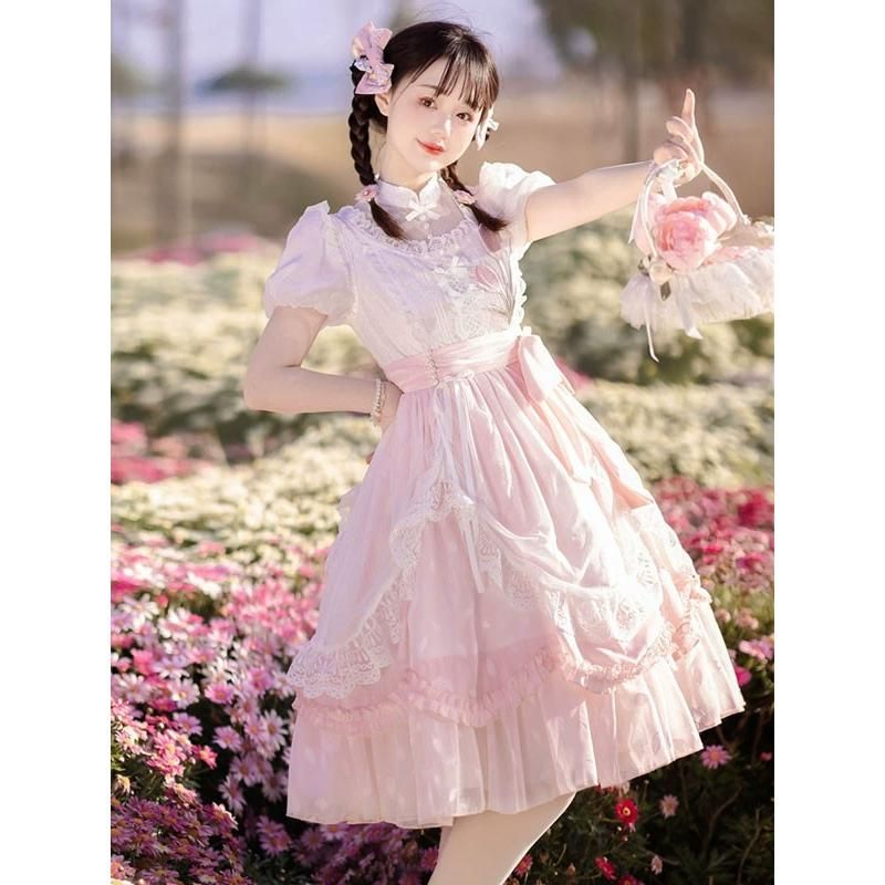 ロリータ ワンピース 洋服 花柄 レディース 膝丈 半袖 リボン パフスリーブ フリル レース Aライン ハイウエスト ロリィタファッション 上品 エレガント