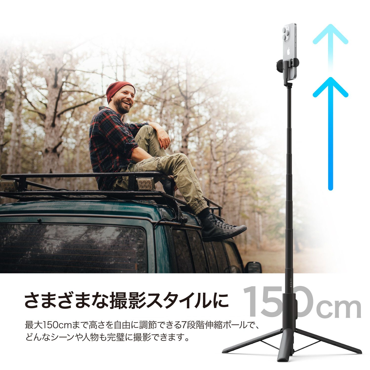 【さまざまな撮影スタイルにフィット】… 最大150cmまで高さを自由に調節できる7段階伸縮ポールで、どんなシーンや人物も完璧に撮影できます。