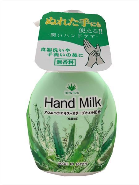 食器洗い・手洗いの後に使えるハンドミルクです。アロエ・オリーブオイル配合で手肌の隅々までしっとり包み込みます。