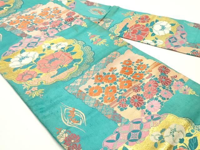 平和屋着物 アンティーク 大正ロマン 九寸名古屋帯 唐織 色紙重ね雪輪草花文 浅葱色 金糸 正絹 ob
