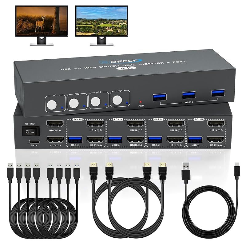 KVMスイッチ HDMI 4ポート、USB3.0 KVM デュアルモニター、UHD 4K@60Hz解像度、HDMI KVM切替器 4入力2出力、アダプティブEDID、ボタン&有線リモコン切り替え対応