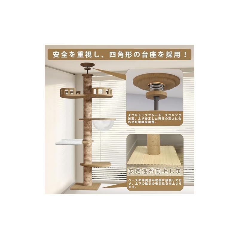【頑丈で安定感抜群】このキャットタワーは、大型猫用に設計された頑丈な木製構造と、優れた安定性を誇る突っ張り式デザインを採用しています。高さは約235~260cmで、調節可能なデザインにより天井にしっかりと固定でき、猫が安心して遊べる安全な空間を提供します。また、12mmの太さの爪研ぎ柱が付いており、家具を傷つけることなく猫が自由に爪を研ぐことができます。複数の猫が同時に爪を研げるスペースも確保されており、猫同士の争いを減らすことができます。