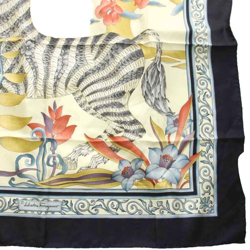 【商品名】サルヴァトーレフェラガモ Salvatore Ferragamo スカーフ ゼブラ柄 総柄 プリント シルク 紺 ネイビー マルチカラー /KU ■OH