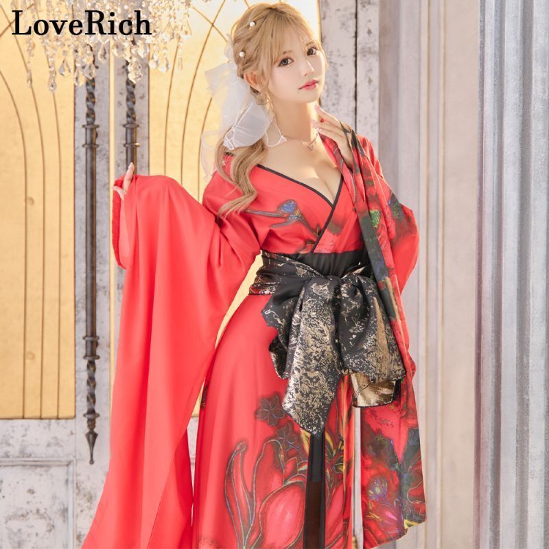 LoveRich ラブリッチ ライン 2 2点セット 花柄 シフォン レース ミニスカート ロング 豪華 花魁 着物 ドレス コスプレ イベント 1321