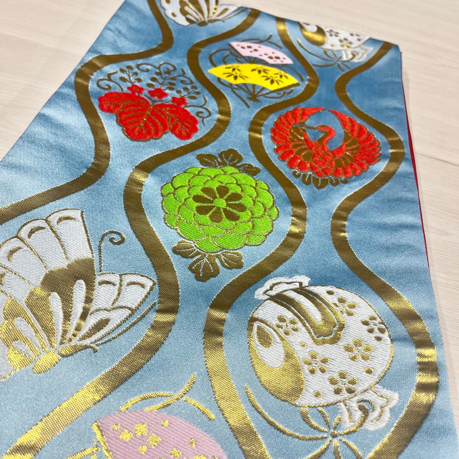 子ども 袋帯 帯 七五三 七歳 子供用 水色 赤 扇子 蝶 鶴 花柄 和柄