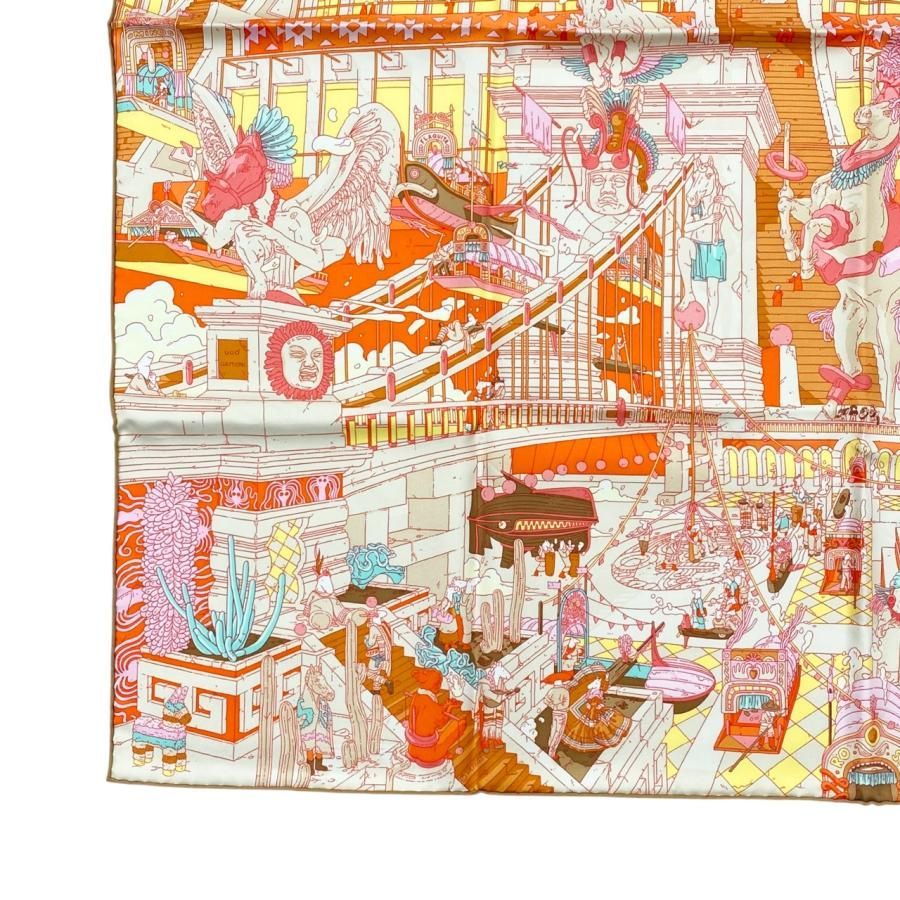 E 4608 エルメス シルクスカーフ カレ90 翼のある馬の伝説 20 コーラル ブラン ジョーヌ ベージュ ブラウン イエロー La Legende du Cheval a Plumes HERMES