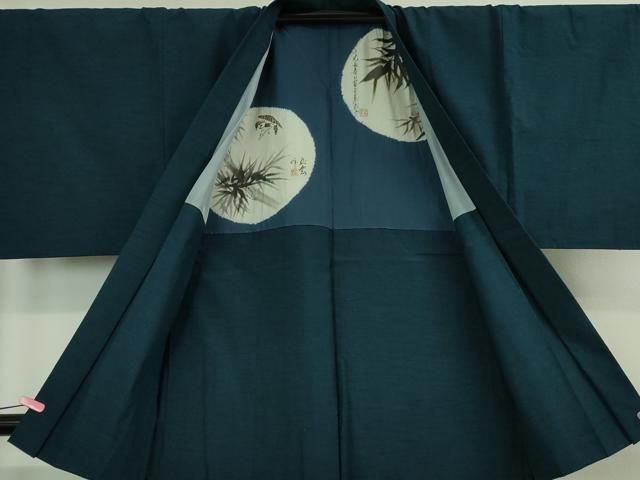 平和屋着物 上 男性 紬 アンサンブル 長羽織 色無地 藍色 羽裏 笹竹に雀 kh 5