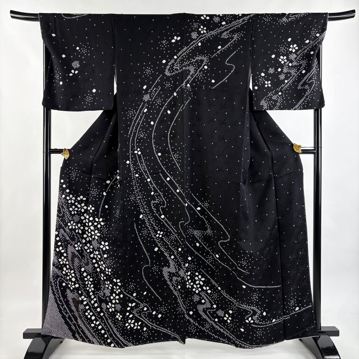 訪問着 身丈161 cm 裄丈68.5 L 袷 花 流水 金彩 絞り 黒 正絹 秀品