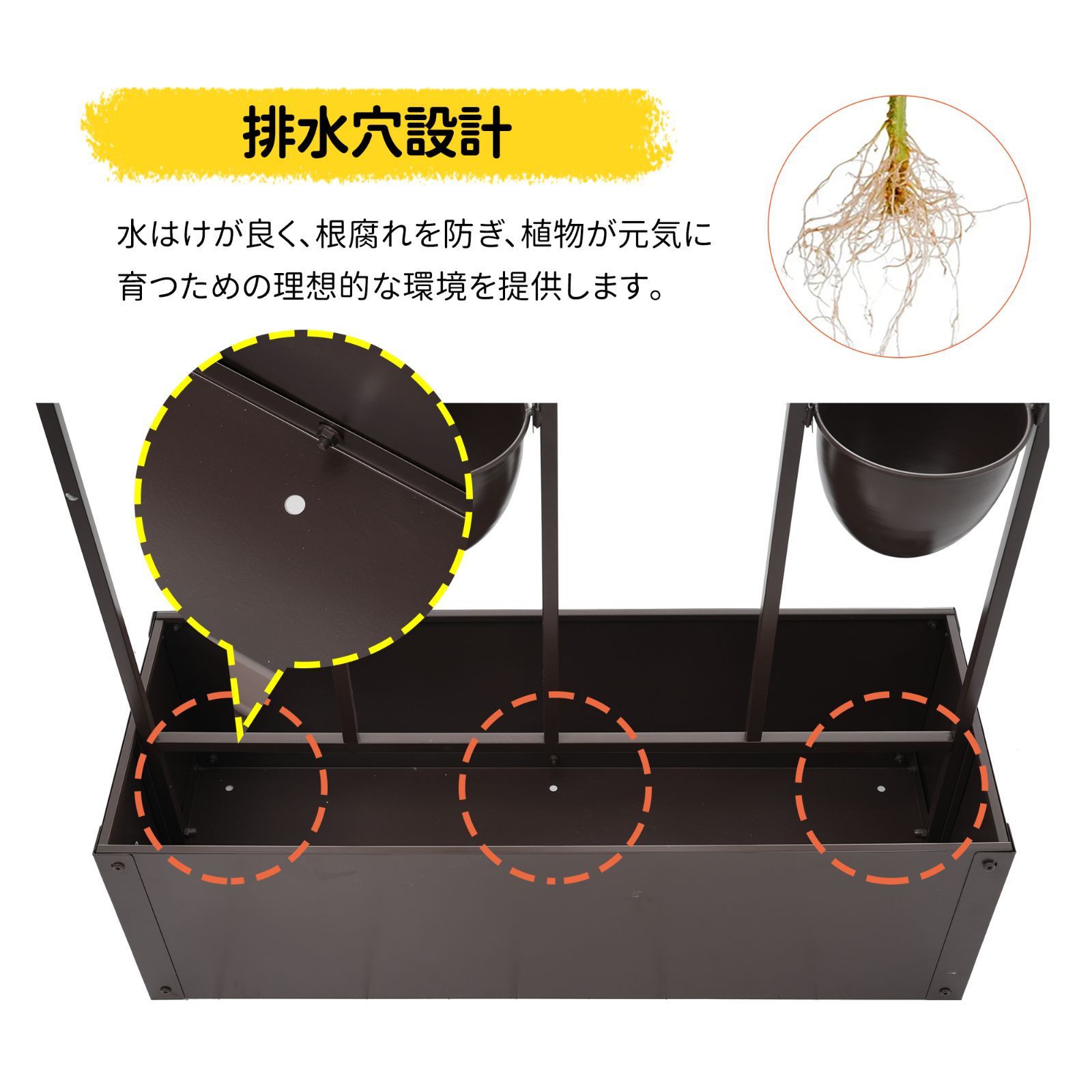 ◎03 しっかりと取り付けられた植木鉢で安定性抜群上部には6つの植木鉢を備え、それぞれフレームにしっかりと取り付けられているため、重量が均等に分散され、植物が偏って成長しても倒れにくく、優れた安定性を実現します。強風でも落下の心配はありません。巧妙なはめ込み構造デザイン植木鉢を簡単に取り外せる設計で、清掃も非常に簡単です。植木鉢のサイズ 直径19cm 高さ15cm 植木鉢の耐荷重5KG 下部のプランター深型設計(27.5cm)で根がしっかり育つ深さ27.5cmの設計で、植物の根がしっかり広がり、健康的に育てられます。プランターの内寸:88*38*27.5cm耐荷重:20kg