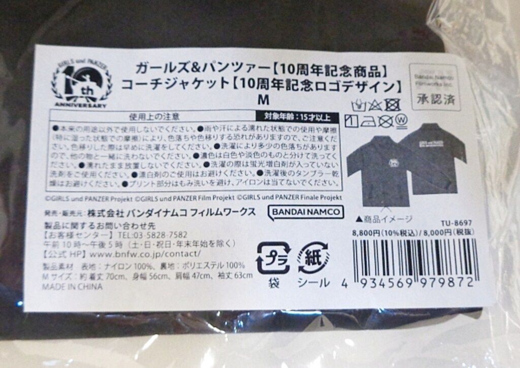 バンダイナムコフィルムワークス ガールズ パンツァー 10周年記念商品 コーチジャケット 10周年記念ロゴデザイン ブラック Mサイズ 黒M
