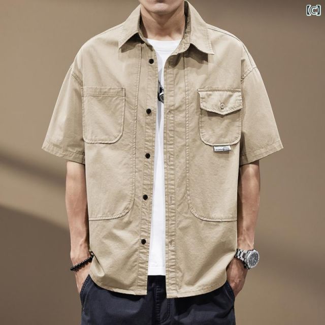 L 秋冬 コーデ メンズ 服 シンプル ファッション オシャレ 大人 かっこいい 大きいサイズ ストリート 紳士服 アメリカン ヘビー ミリタリーグリーン ワークウェア 半袖 シャツ カジュアル ジャケット