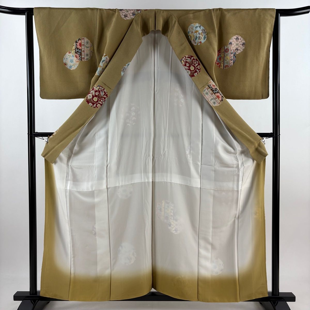 小紋 身丈159.5 cm 裄丈63 S 袷 花唐草 金彩 縮緬 薄茶色 正絹 秀品