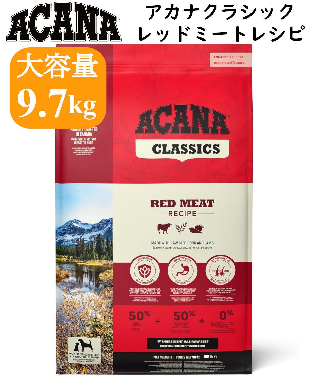 アカナクラッシック レッドミートレシピ 9.7 kg ドッグフード 大容量 ラム肉牛肉豚肉オーツ野菜果物贅沢ごはん 犬用 成犬 中型犬大型犬